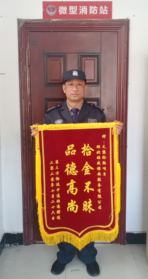 2020年10月23日,湖北領威保安服務有限公司駐武漢天黎輪胎項目保安隊獲得中通快遞員贈送的錦旗,他對領威保安隊員的拾金不昧精神表示贊揚和感謝!