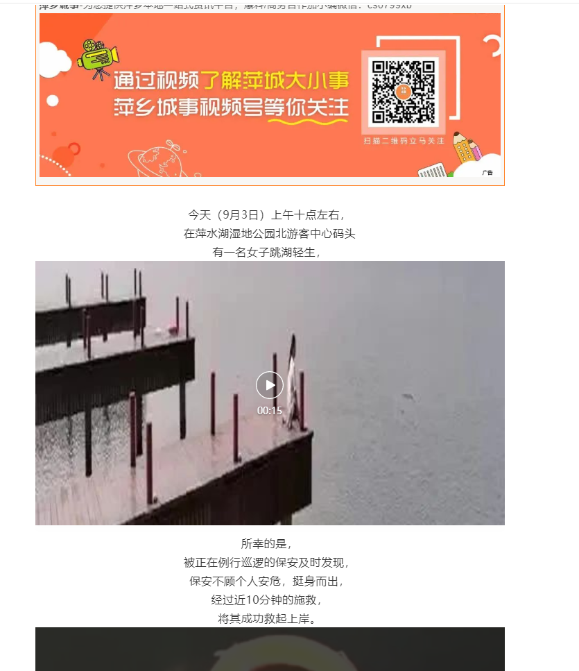 當天下午,萍鄉(xiāng)本地新媒體萍鄉(xiāng)城事對事件進行了報道,感謝所有參與施救的人員。 萍鄉(xiāng)市開發(fā)區(qū)園林局朱局長親臨萍水湖濕地公園,特別表揚了班長鄧友國挺身而出,勇于救人的行為。