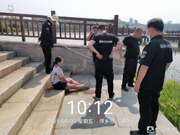 9月3日上午10點左右,領威保安駐萍水湖濕地公園項目保安員陳海軍在萍水湖濕地公園北游客中心碼頭正常巡邏時,發(fā)現(xiàn)一名女子坐在碼頭邊上,疑似有輕生念頭。保安員陳海軍立即上前準備詢問,被該女子制止。陳海軍見此情景,馬上通過對講機和微信工作群聯(lián)系當班班長和隊長。當班班長譚志剛、鄧友國得知消息后立刻報警,并迅速趕往現(xiàn)場。班長鄧友國趕到時,發(fā)現(xiàn)該女子已經(jīng)跳入湖中,如果不及時救援,該女子就會有生命危險。班長鄧友國急忙打開碼頭消防柜,拿著救生圈果斷地跳入湖中,游到該女子身邊進行水中施救。經(jīng)過近10分鐘的施救,該女子被成功拖到岸邊,上岸后,區(qū)域總監(jiān)易衛(wèi)華、隊長張繁榮組織保安員將該女子圍住,以防止該女子再有輕生行為。待女子情緒稍微安定后,易總開始對女子進行耐心勸解,并將其帶到陰涼處休息,等待當?shù)嘏沙鏊窬瘉硖幚怼?br />