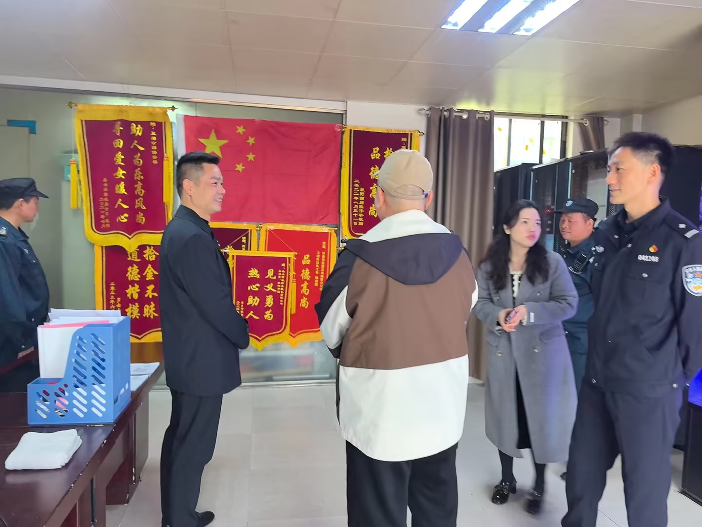 3月14日,在我公司萍鄉(xiāng)玉湖項目現(xiàn)場,上演了一幕莊重而溫馨的場面。萍鄉(xiāng)市公安局治安警察支隊內(nèi)保大隊長危湘,萍鄉(xiāng)市保安行業(yè)協(xié)會秘書長鄧宗淼,萍鄉(xiāng)市保安行業(yè)協(xié)會辦公室主任盧寒親自前來,為李興萍、歐陽開福兩位保安員送上了錦旗和慰問金。這面錦旗,是萍鄉(xiāng)市保安行業(yè)協(xié)會自成立以來的第一面錦旗,更是市局內(nèi)保大隊長首次出面贈送的榮譽,它不僅僅是對兩位保安員英勇行為的贊揚,更是對整個領威安保團隊工作的肯定,意義非凡。