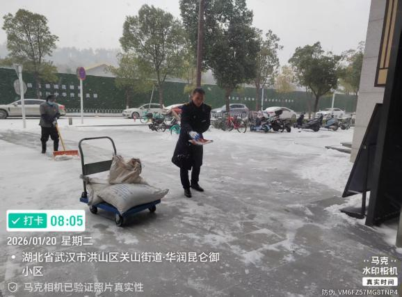 連日來,湖北遭強冷空氣侵襲,寒潮攜雨雪而至,氣溫驟降。1月20日凌晨,大范圍雨雪致路面積雪冰凍,給市民出行安全和城市安保工作帶來考驗。面對這場“凍”考,湖北領(lǐng)威保安服務(wù)有限公司全員齊心,管理層靠前指揮,一線隊員沖鋒在前,迅速落實舉措開展防寒除冰工作,展現(xiàn)新時代安保人的使命擔當。