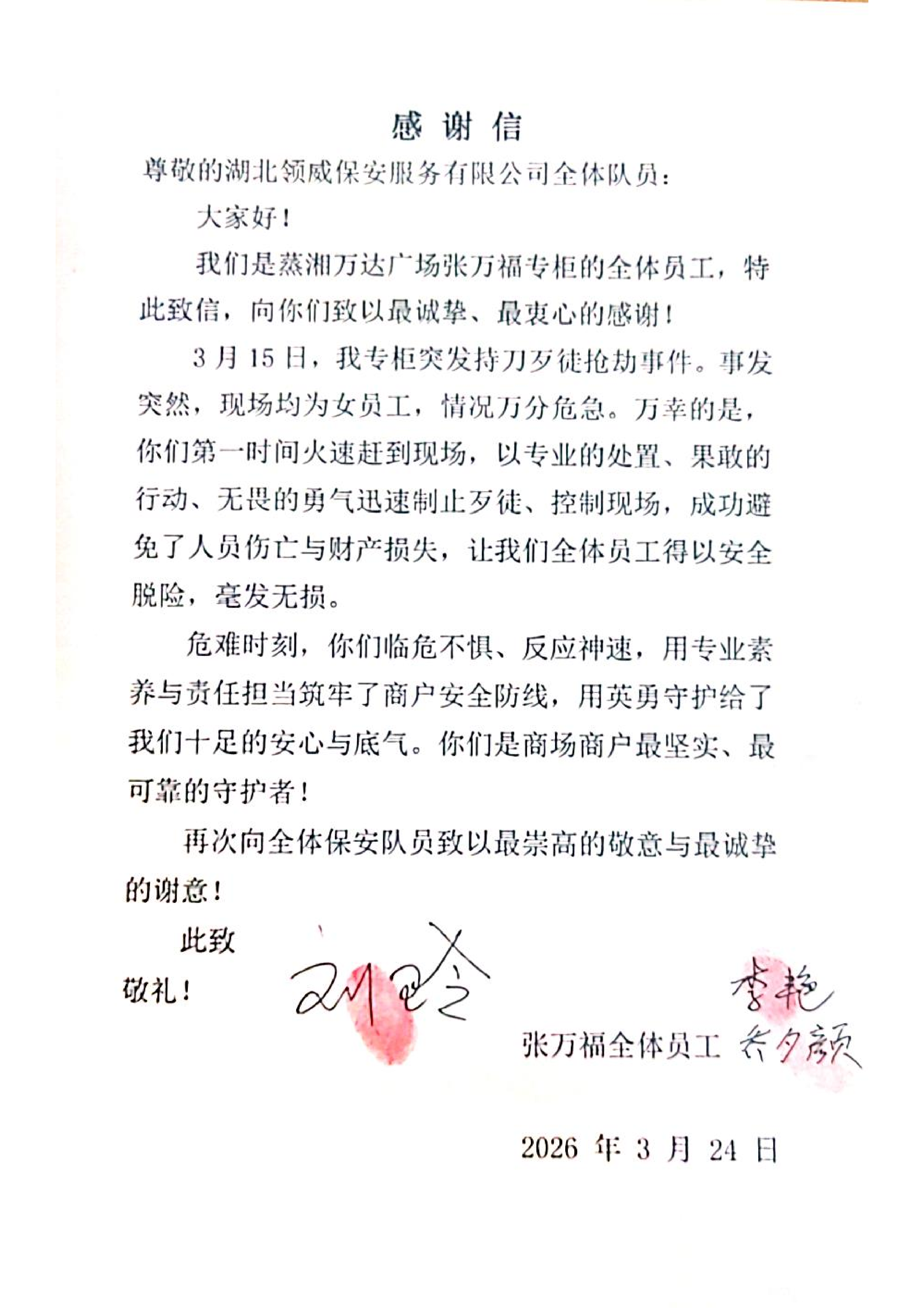 近日,湖北領(lǐng)威保安服務(wù)有限公司收獲一份特殊榮譽--由湖南衡陽蒸湘萬達廣場張萬福珠寶專柜專程送來感謝信與錦旗,致謝領(lǐng)威安保隊員聯(lián)合警方快速處置持刀搶劫突發(fā)事件、全力守護商戶生命財產(chǎn)安全的英勇之舉與責(zé)任擔(dān)當(dāng)。