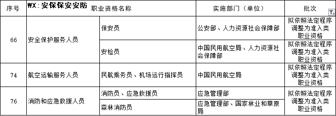 為貫徹落實(shí)2019年12月30日國務(wù)院常務(wù)會(huì)議精神,擬分批將水平評(píng)價(jià)類技能人員職業(yè)資格退出目錄,其中:人力資源社會(huì)保障部門和有關(guān)部門組織實(shí)施的14項(xiàng)職業(yè)資格(涉及29個(gè)職業(yè))擬于9月30日前第一批退出;其他部門(單位)組織實(shí)施的66項(xiàng)職業(yè)資格(涉及156個(gè)職業(yè))擬于12月31日前第二批退出;與公共安全、人身健康等密切相關(guān)的職業(yè)(工種)擬依法調(diào)整為準(zhǔn)入類職業(yè)資格(具體安排詳見附件)。