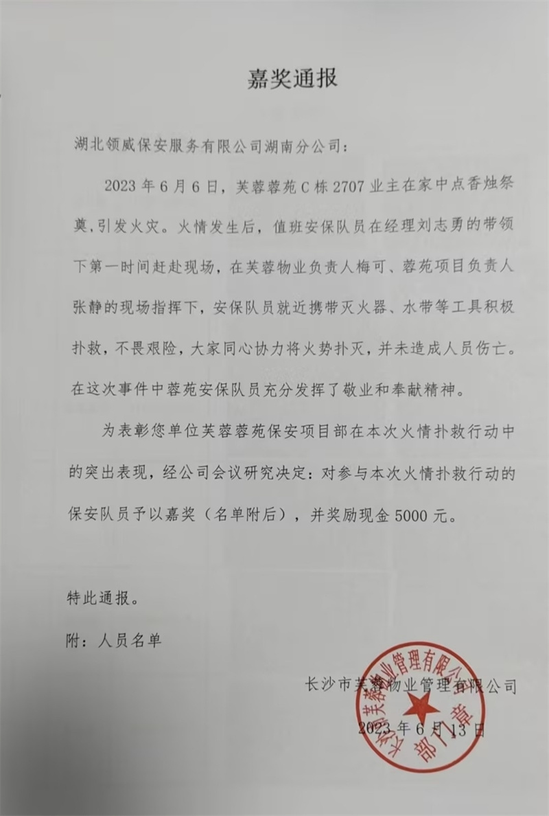客戶單位長沙市芙蓉物業(yè)公司對此次事件中參與救火的安保隊員們的敬業(yè)奉獻精神給予了高度的評價及贊賞,并發(fā)布表揚通告獎勵現(xiàn)金5000元,以此來肯定隊員們的突出表現(xiàn)。