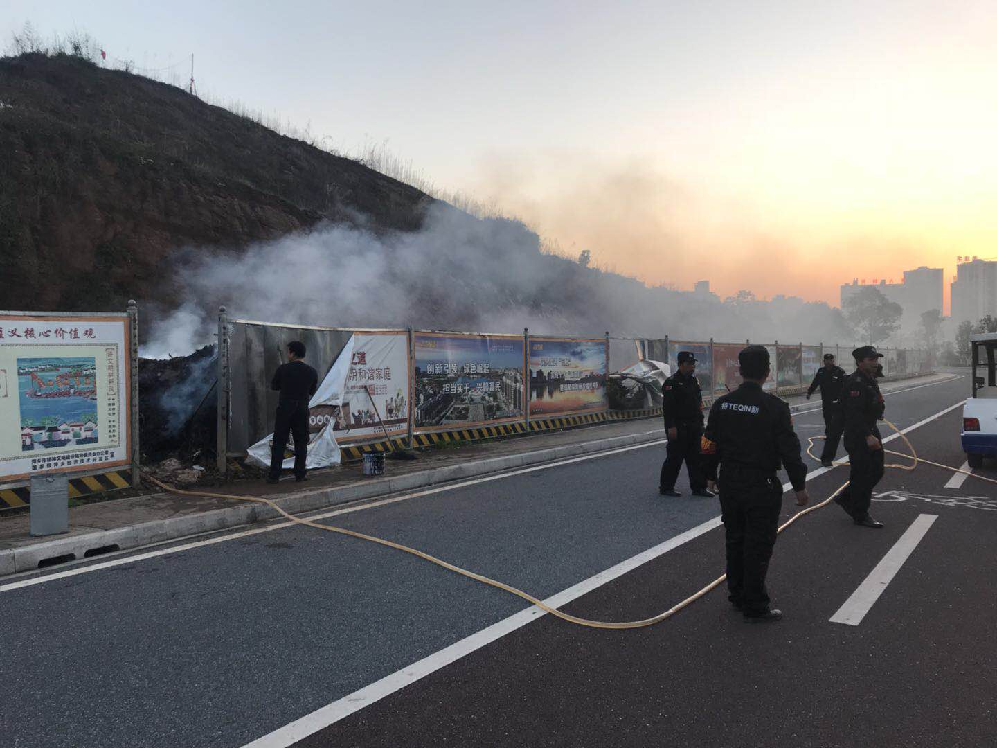 3月9日下午17:30分,萍鄉(xiāng)玉湖公園駐點南廣場值班保安員通報火情,南廣場與外部連接處山體發(fā)生明火,駐點保安經(jīng)理向培重剛剛陪同江西省委領(lǐng)導(dǎo)視察玉湖公園項目后,正在對園區(qū)進行例常巡查,接到通報后立即通知臨近崗位值班人員快速支援,利用就近的消防栓迅速展開滅火行動,在全體值班保安員共同努力下, 2小時后徹底將火情消除。為防止暗火復(fù)燃,現(xiàn)場留下了兩名值班保安員關(guān)注到夜間23:00才撤回,客戶單位對我司參與滅火的所有人員進行了嘉獎,并對我司日常培訓(xùn)后的效果及快速反應(yīng)能力表示贊賞。